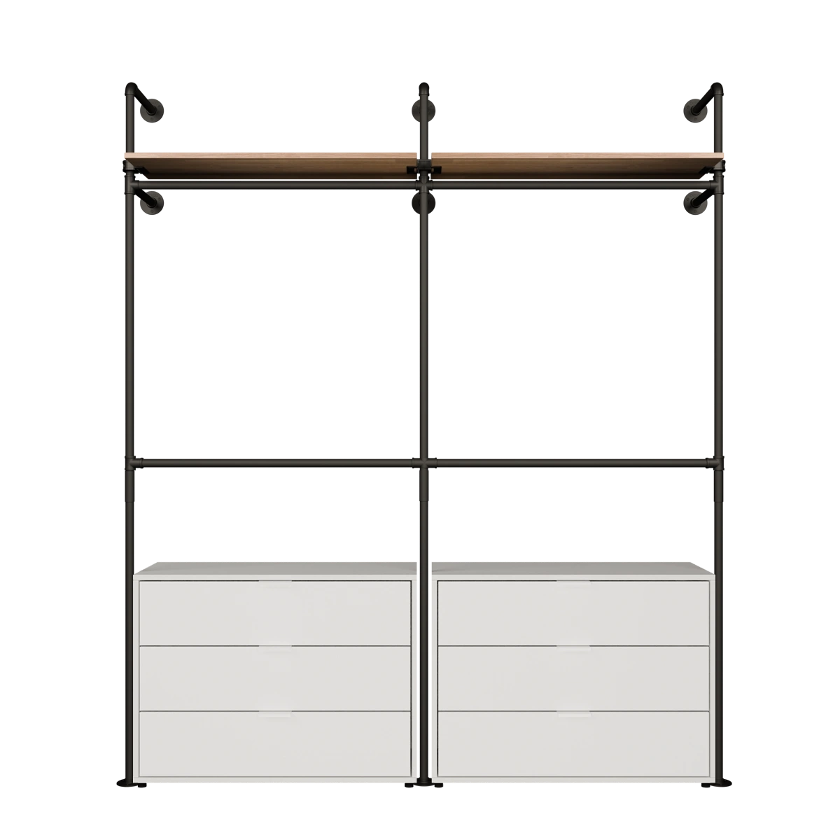 Med den sorte matte pulverbelægning på vores vandrør og det mørke træ på vægreolen sætter du et rustikt præg i industrielt design med vores rørmøbler. Dine tøjstykker står, takket være den enkle sorte farve, stadig i fokus og kommer elegant til sin ret.
