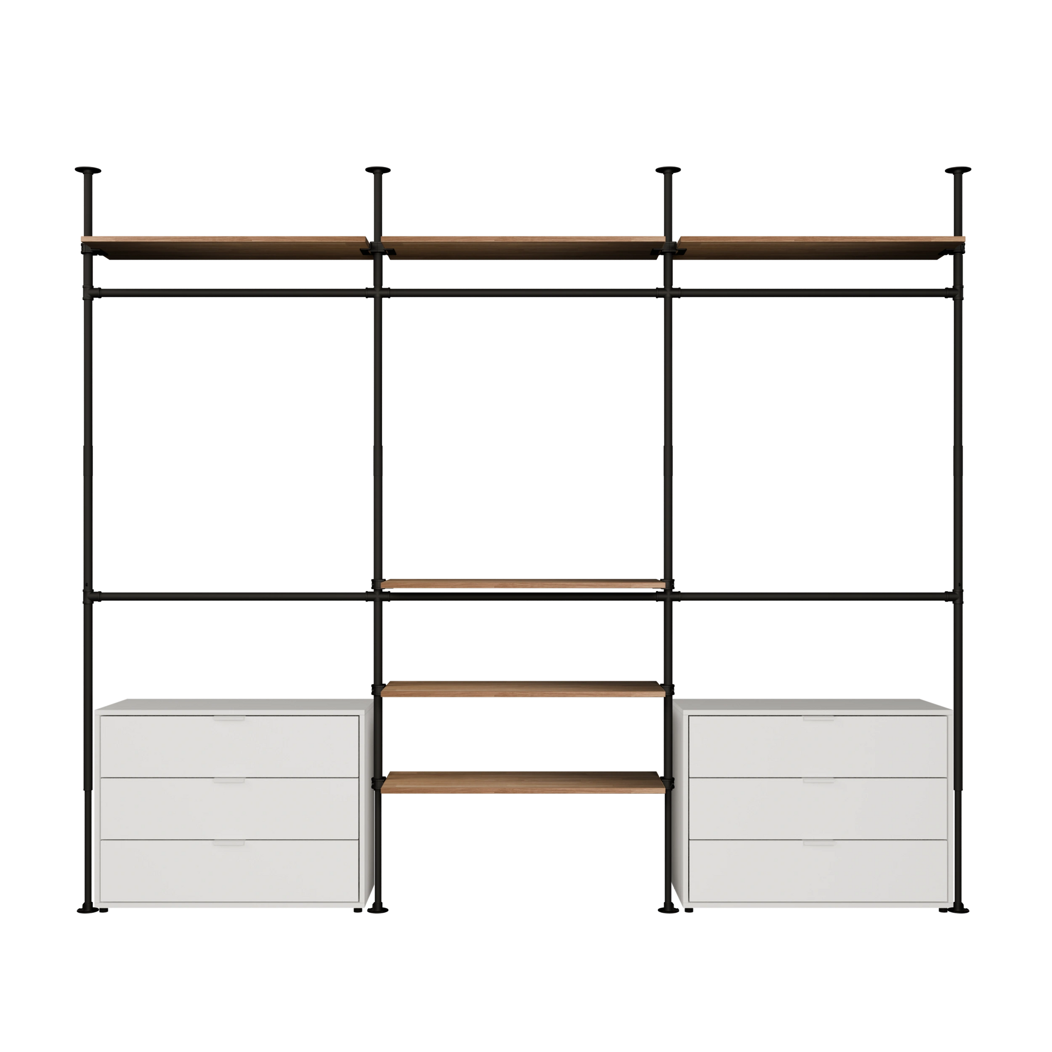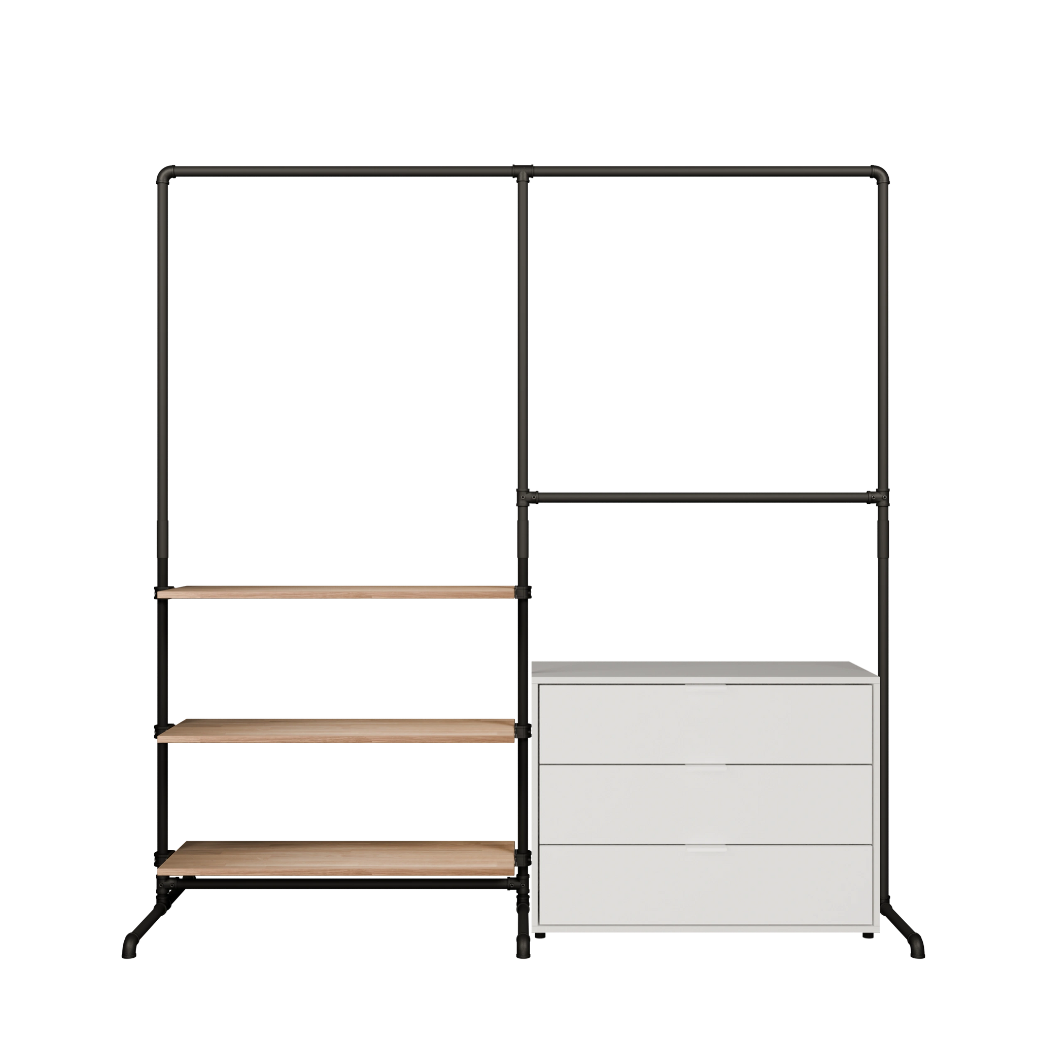 Overvejer du, om en åben garderobe er det rigtige for dig, og undrer dig over, hvilke fordele den kan give? Reol tøjstangen giver dig ikke kun masser af plads til at hænge alle dine klæder op, men de manglende vægge gør også dit rum lysere og får det til at virke større. Metaltræ væggen reol lader lyset flyde ind i rummet med sit åbne design og blokerer det ikke, som et traditionelt skab. Vores kombination af metal og træ gør reol tøjstangen perfekt til at hænge alle dine kjoler og frakker op, og vores kombinationer giver dig også rigeligt med plads til at opbevare bukser eller foldede T-shirts. Med det minimalistiske design af de sorte vandrør i vores reol tøjstang kommer dine tøjstykker i fokus, og du kan se alt på et øjeblik.